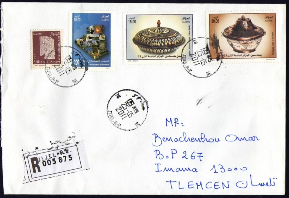- Les timbres choisis sont parmi les émissions de 2011. Ceux de droite concernent une émission appréciée consacrée aux "Ustensiles des Traditions Culinaires Algériennes". Les 2 timbres de la série émis le 19 Avril 2011, sont présents (15 et 30 da). A droite le pot à beurre et à gauche le plat de couscous, tous deux en cuivre rouge étamé et datant du 18ème siècle et provenant de la région d'Alger la capitale.