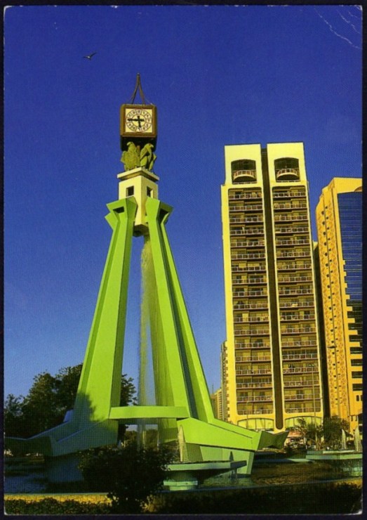 La carte représente la tour de l'horloge d'Abu Dhabi, site incontournable de 200m de haut, visible sur la nouvelle corniche de la ville et conçue par l'architecte "Roger Taillibert":