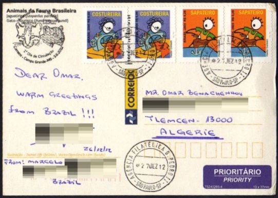 Les 02 mêmes timbres du milieu est pris d'une émission de 3 timbres datant du 19/12/2005 et consacré aux métiers artisanaux du Brésil. Un cordonnier ici.